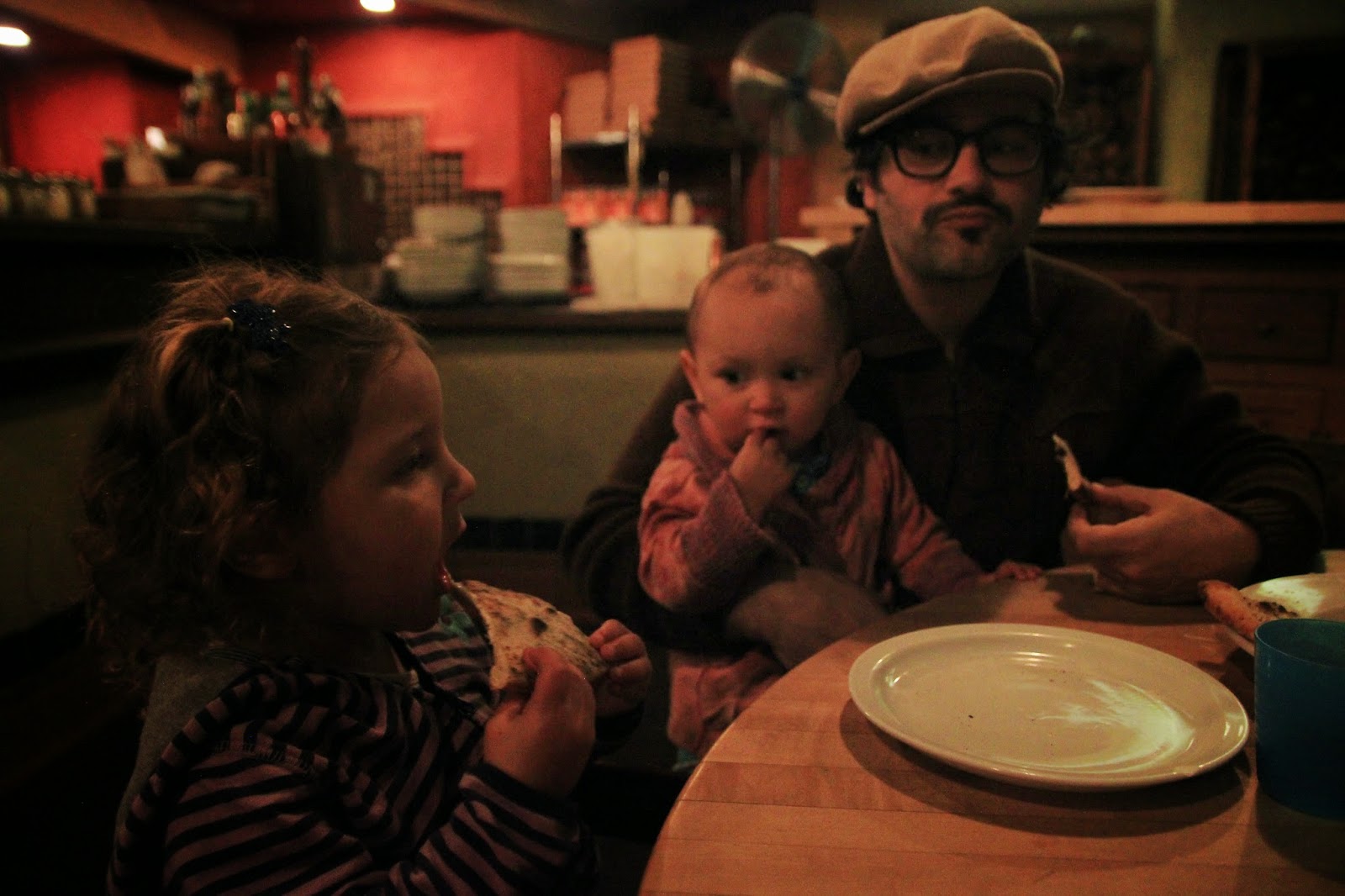 We rinsed our feet at the outdoor shower and heard an owl hooting. Then it was time to head back down that windy road to Point Reyes Station for dinner at Cafe Reyes. We remembered having really good pizza there a couple years ago when we just had Lucy. In the car Darin and I looked at each other and said, "Can we really pull this off?" We rarely go out to eat anymore especially to "grown up" restaurants. But miraculously the girls were great! Darin held Polly on his lap all through dinner (she was too wriggly for the high chair) and both girls chowed down on wood-fired cheesy bread. I had a salad with bleu cheese from Point Reyes farmstead creamery and it was perfection with a glass of Pinot Noir.