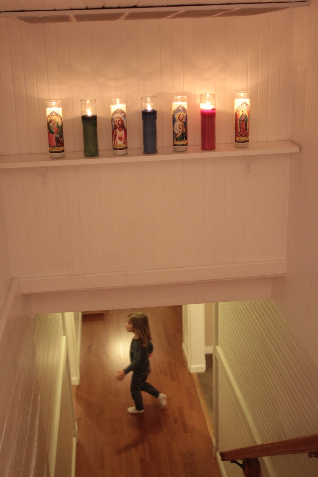 Looking down at the "lighted ladies" and then Daddy's back to work! One of the busiest bookstore days of the year, so grateful to his coworker Candis for letting him come be with us.